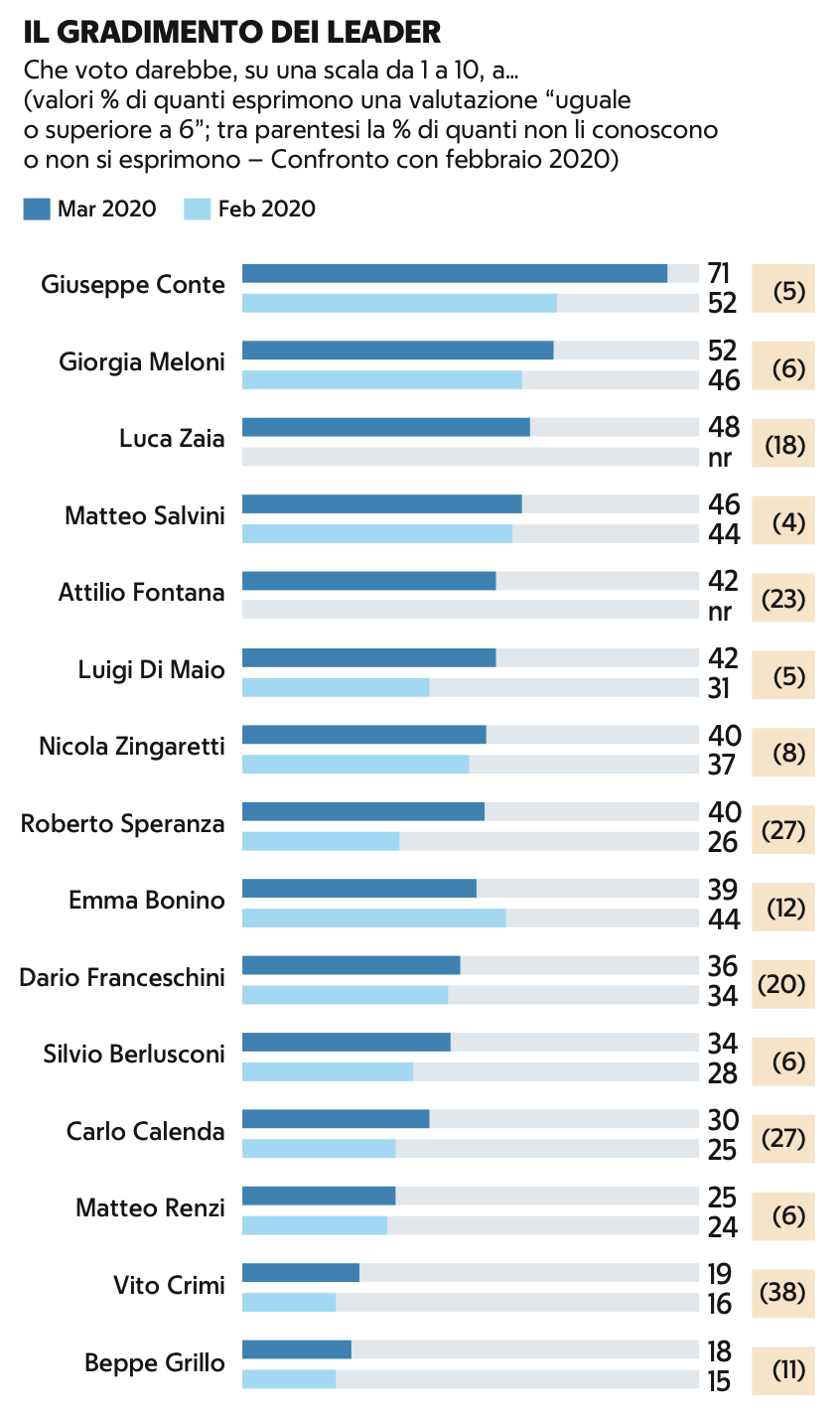 Og som en annen meningsmåling sier, som er referert i storavisa La Repubblica: på grunn av frykten godtar 40 prosent av velgerne at demokratiet er satt til side. Og som avisa skriver i sin kommentar: